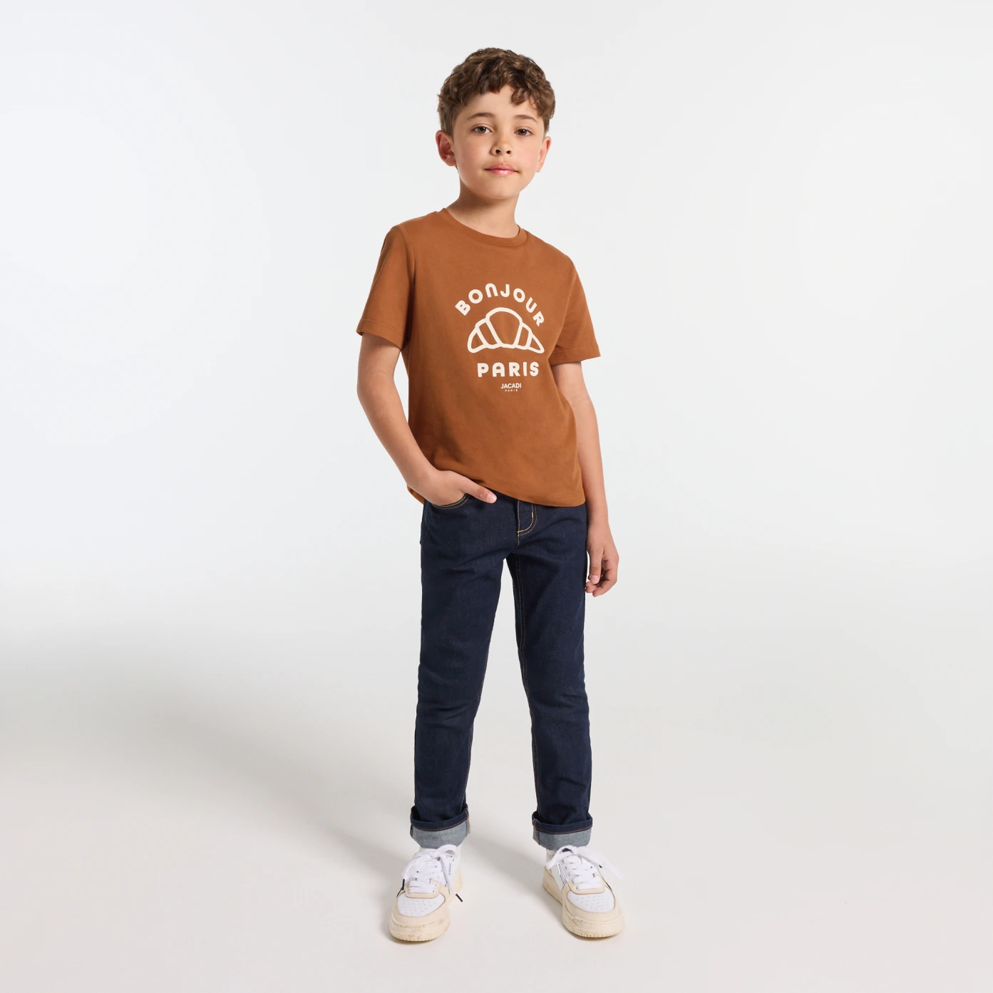 本季男童牛仔褲以全新剪裁與柔軟舒適面料呈現,採用經典直筒版型與略寬褲管,褲腳飾以駝色滾邊縫線,為丹寧風格注入現代感。日常穿搭首選,可與海軍藍針織衫或拉鍊外套輕鬆搭配,打造百搭造型。