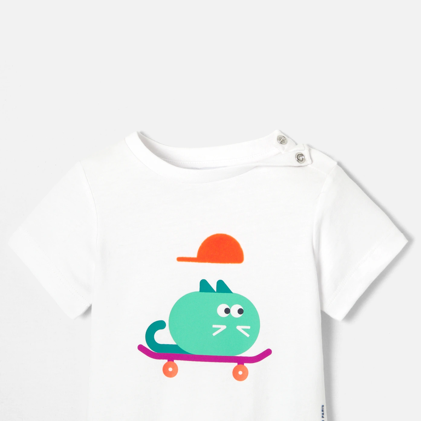 這款 T 恤採用柔軟棉質布料,印有可愛的滑板貓圖案,充滿春日的活潑氣息。非常適合日常穿著,搭配吊帶褲或是短褲,打造城市風格穿搭。