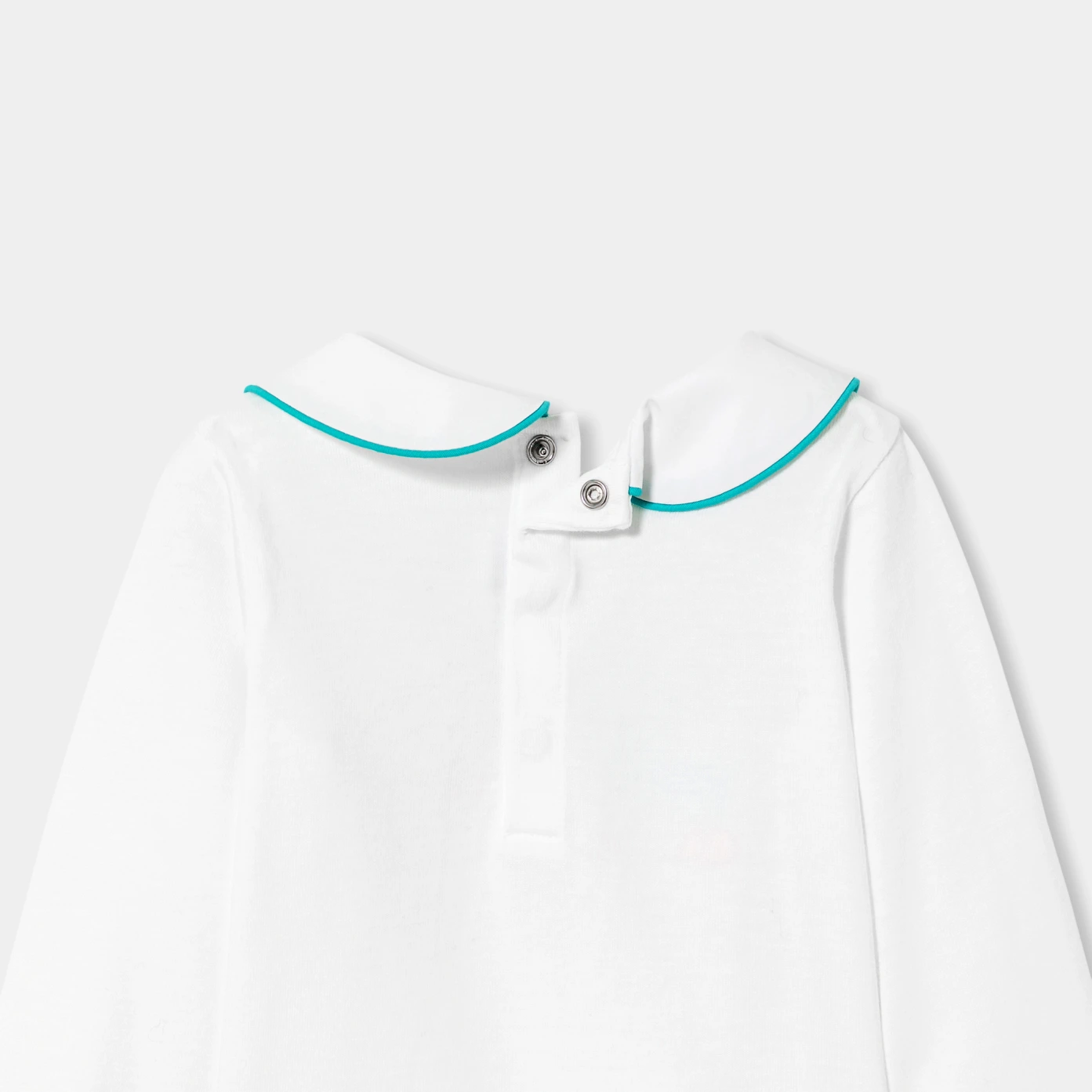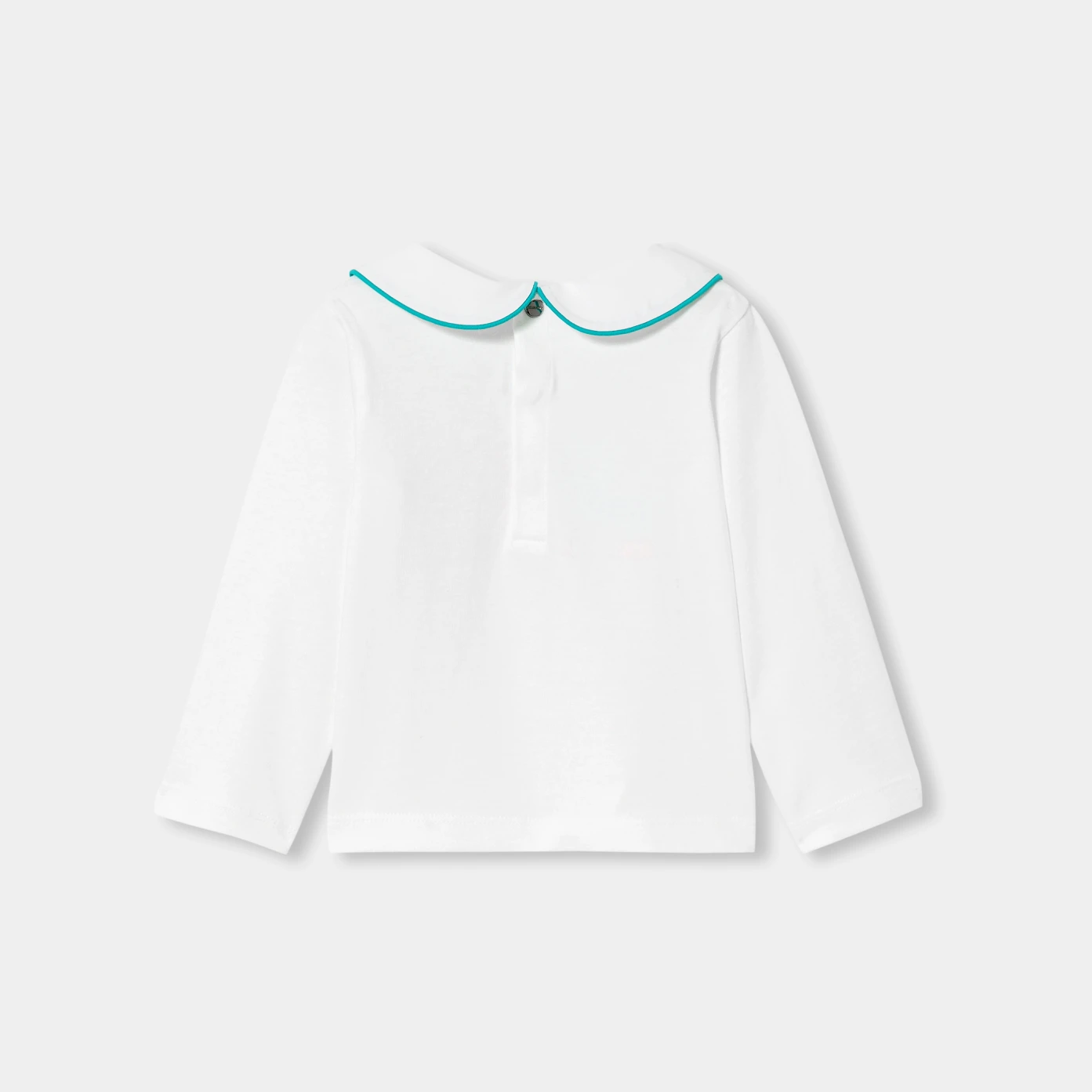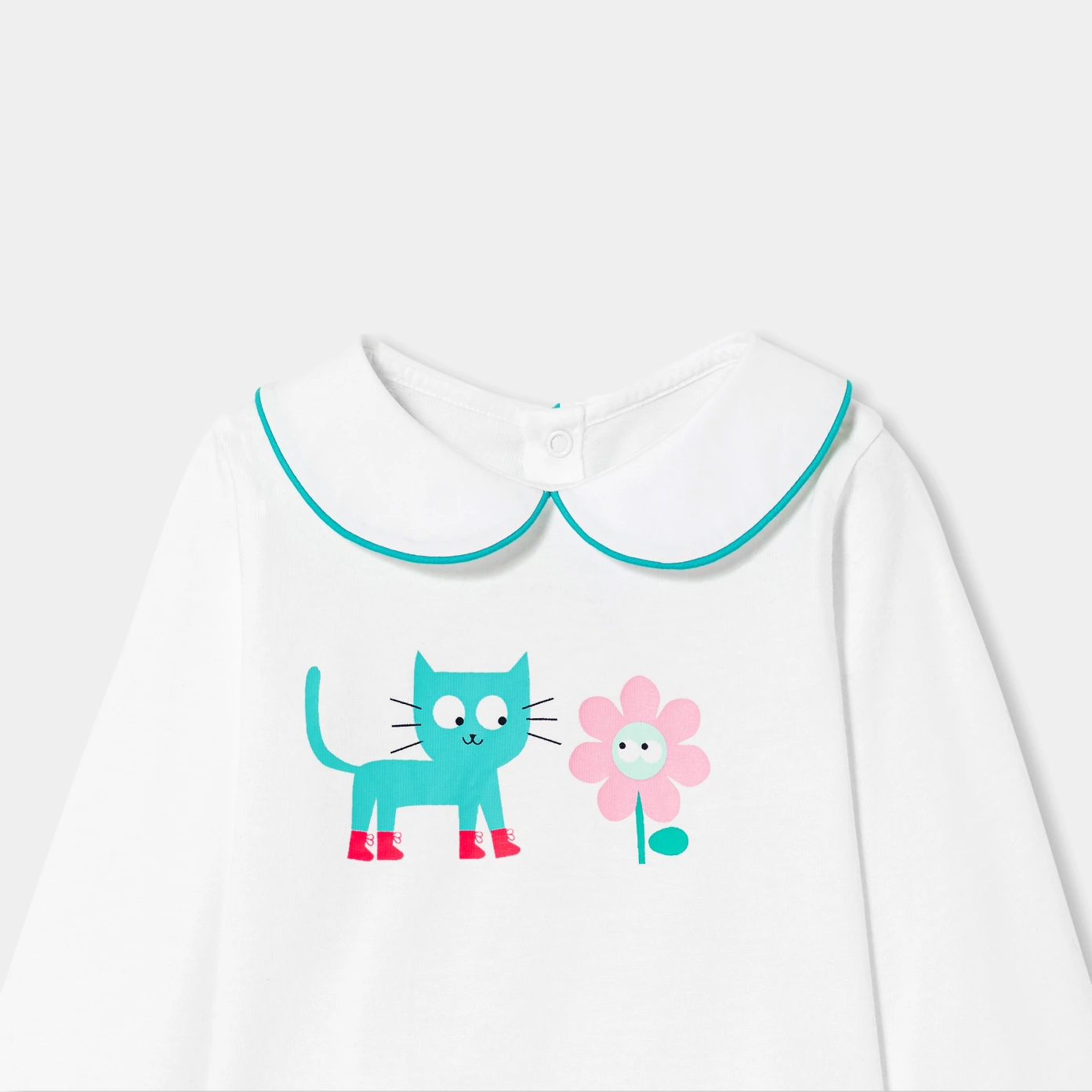 這款充滿歡樂色彩的小女童長袖T恤,以有趣的場景點綴日常生活。採用環境友善的棉花製成,搭配彼得潘領和對比色滾邊,背面按扣開合設計讓穿脫更加方便。可搭配燈芯絨短褲和同色系針織外套,打造現代且充滿活力的時尚造型。