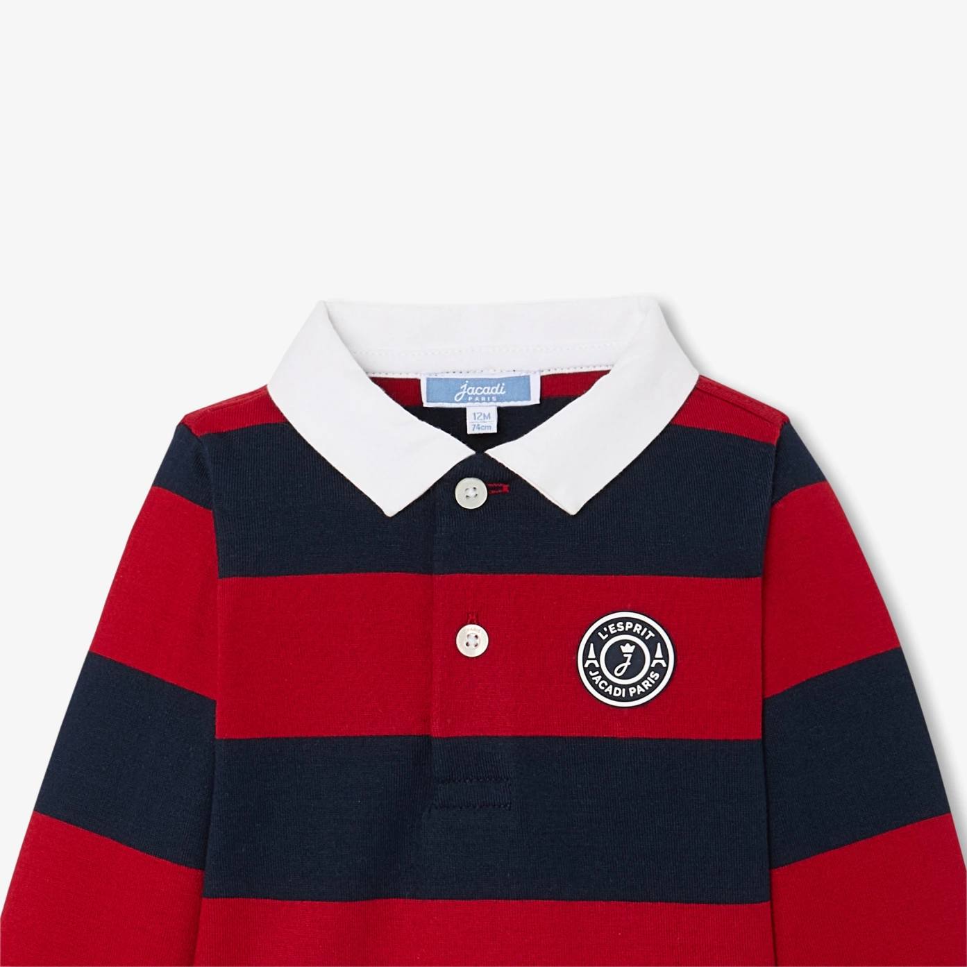 這款長袖男寶寶有機棉 Polo 衫是衣櫥中的經典基本款。設計靈感來自橄欖球風格,運用雙色寬條紋與對比感十足的白色牛津布領口,展現活力十足的運動時尚。胸前點綴 Jacadi 徽章,舒適的經典剪裁,無論搭配牛仔褲或卡其褲,都能輕鬆打造出優雅又休閒的造型。