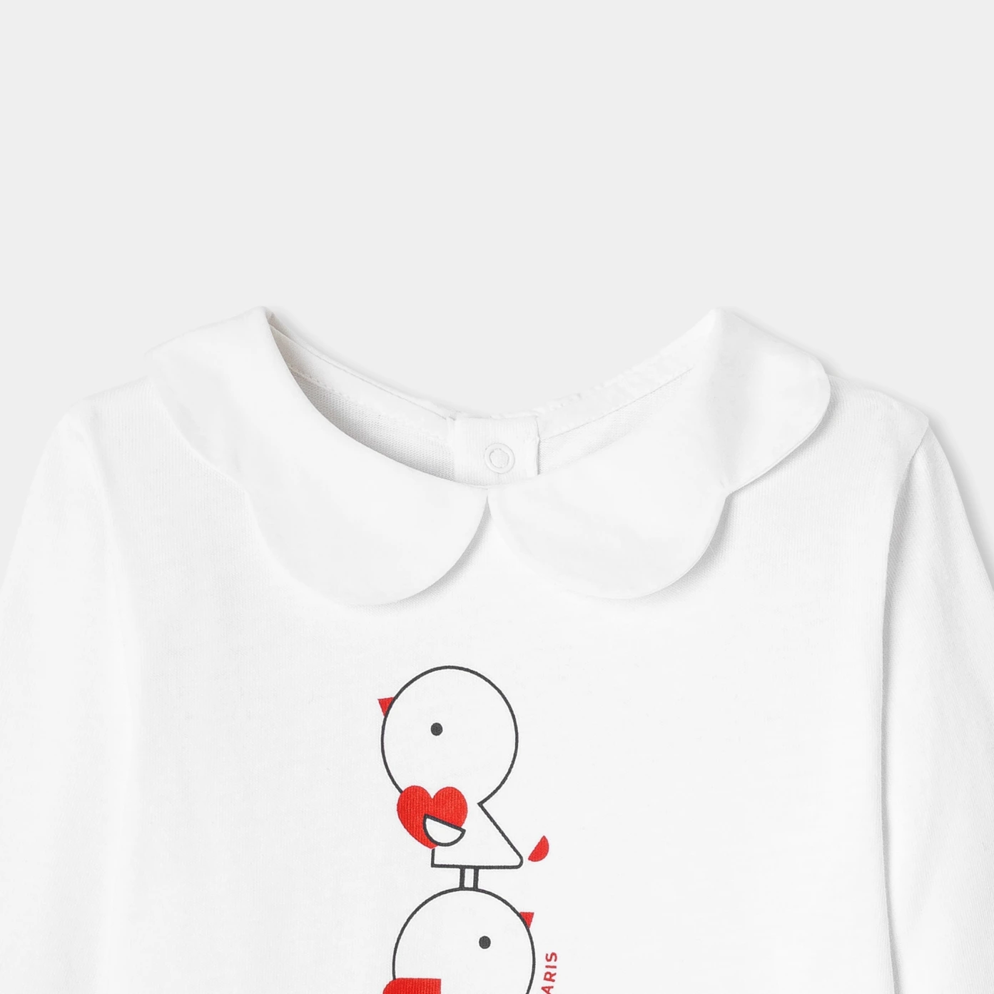 這款有機棉針織長袖女寶寶T恤,讓日常穿搭既俏皮又優雅。特色在於花瓣領設計,搭配趣味印花,深受小女孩喜愛。背部按釦開合,方便穿脫,是衣櫃中的必備單品。可與天鵝絨短褲及繽紛開襟衫搭配,營造色彩豐富的法式風情。