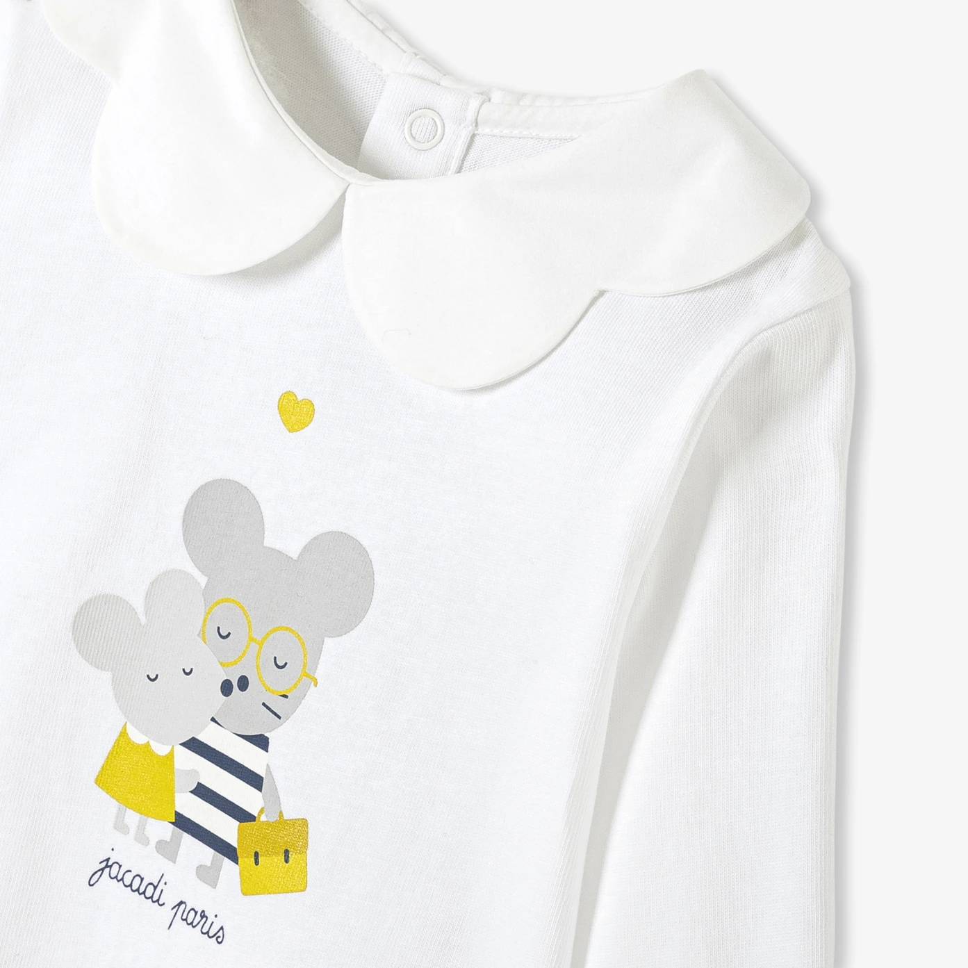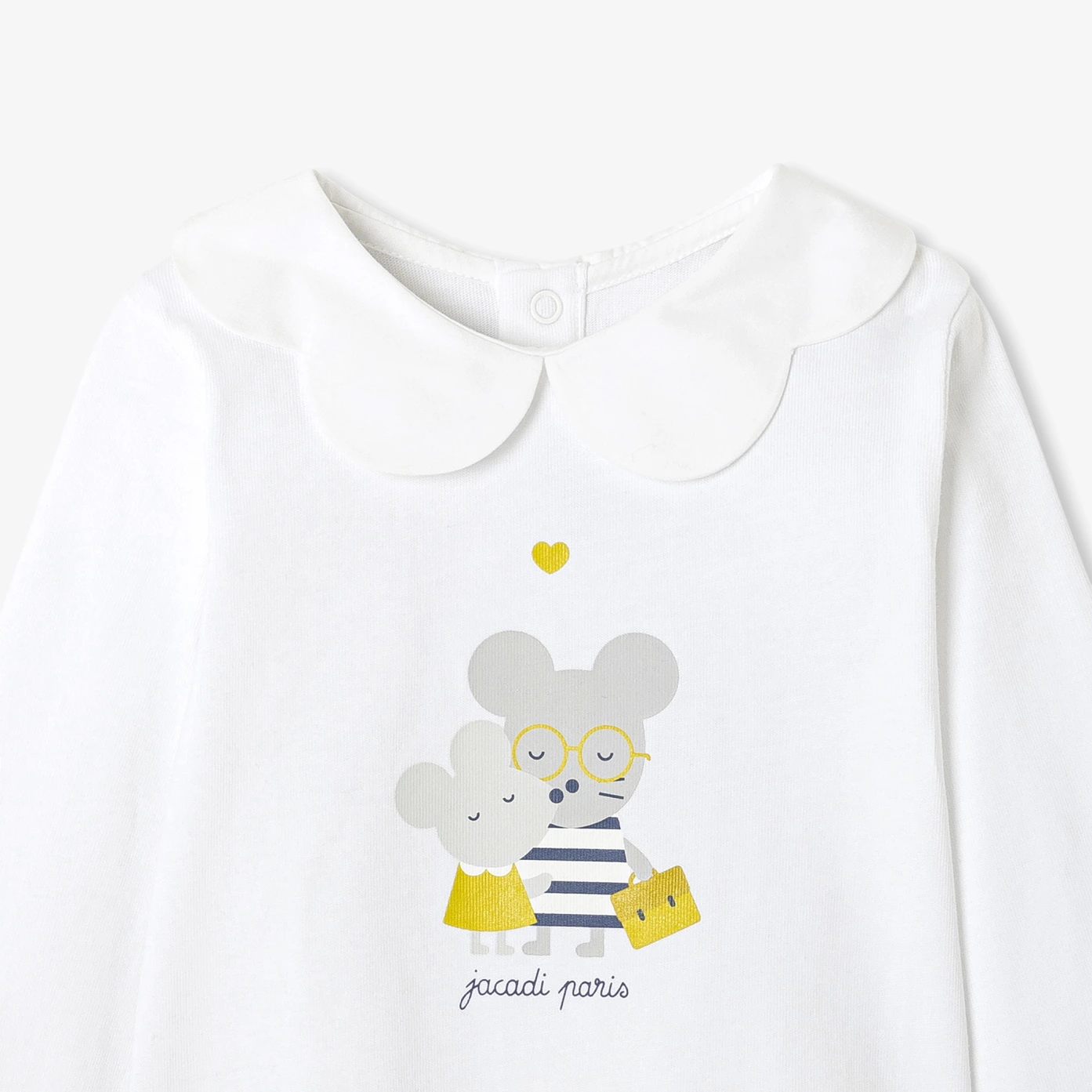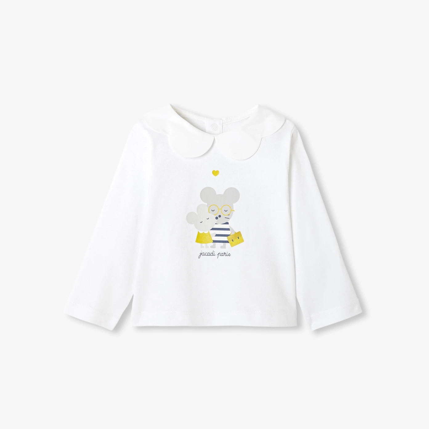 這款女寶寶長袖T恤以經典百搭的設計,展現全新俏皮風格。柔軟有機棉質搭配優雅花瓣領,前片趣味印花增添亮點,無論與牛仔褲或條紋天鵝絨短褲搭配,都能輕鬆打造學院風造型。