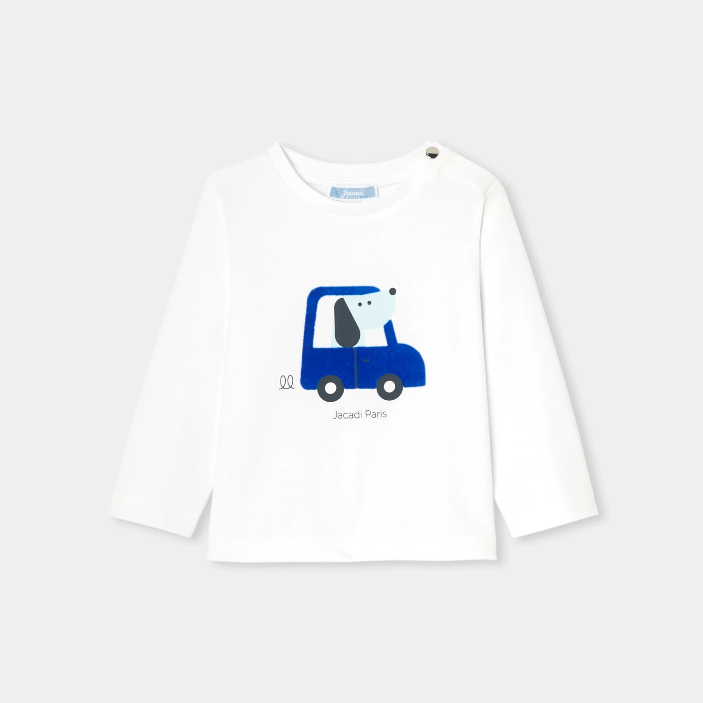 設計師每季都以俏皮圖案為男寶寶T恤注入活力。這款長袖T恤飾以可愛小狗開車圖案,並設有肩部按釦設計,方便日常穿脫。實穿百搭的基本單品,可搭配牛仔褲或燈芯絨長褲,展現輕鬆休閒風格。