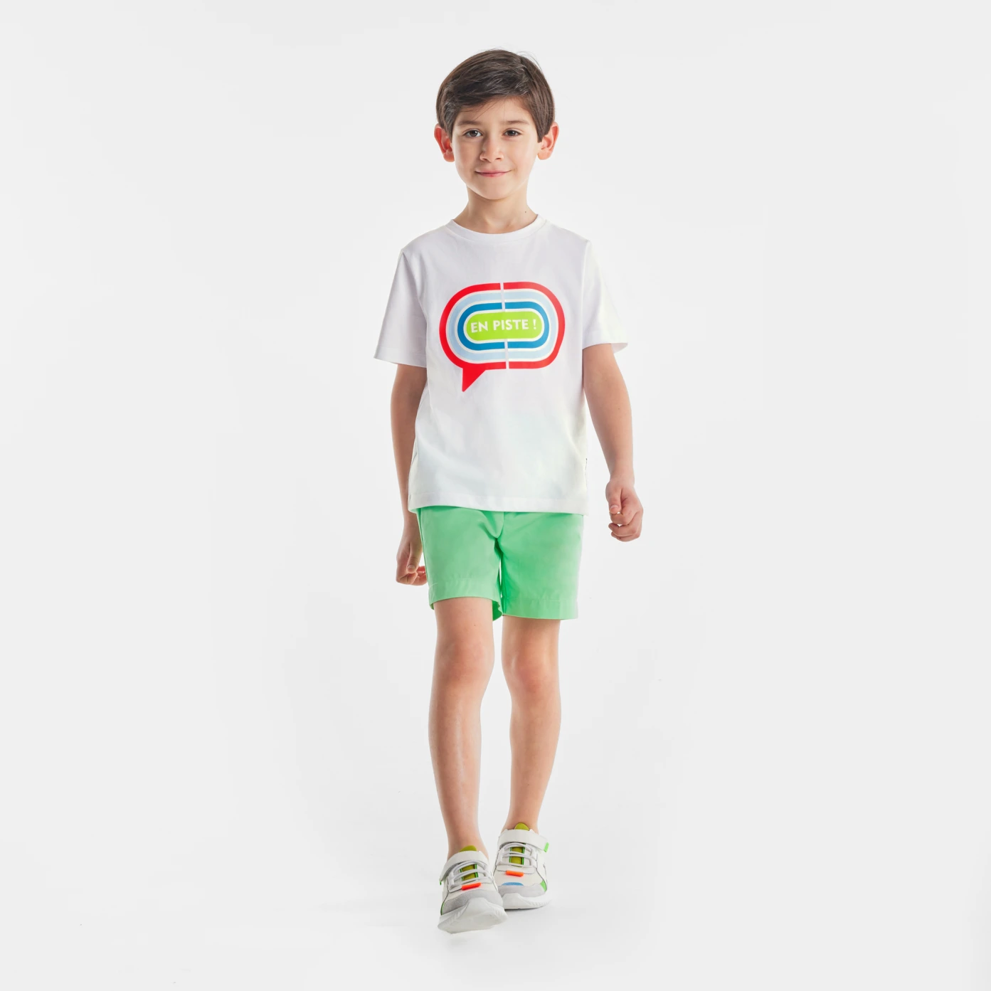 這款男孩 T 恤採用有機棉製成,印有田徑跑道,已準備好跟隨您的男孩整個夏天。