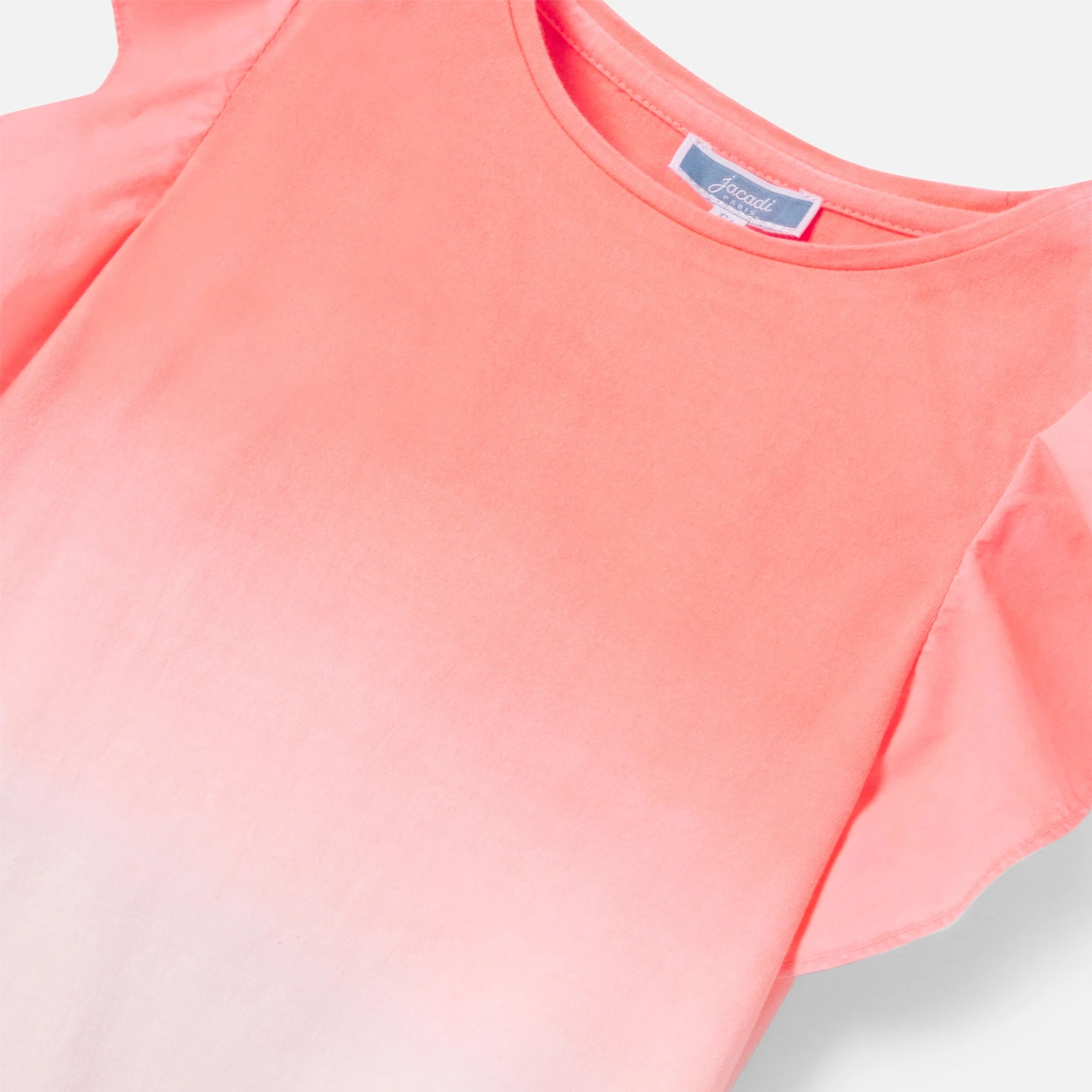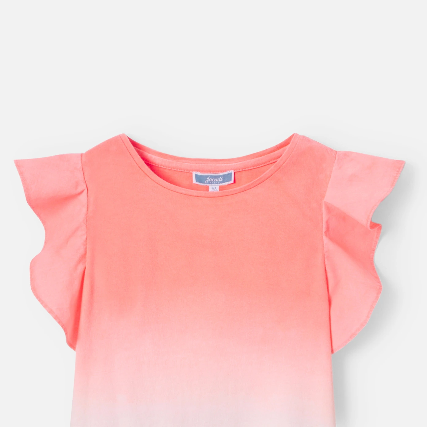 這件看起來大膽的T恤設計,為現代、多彩的夏季注入了活力。採用漸變染色效果,並添加荷葉邊袖,適合搭配泡泡紗短褲和涼鞋。