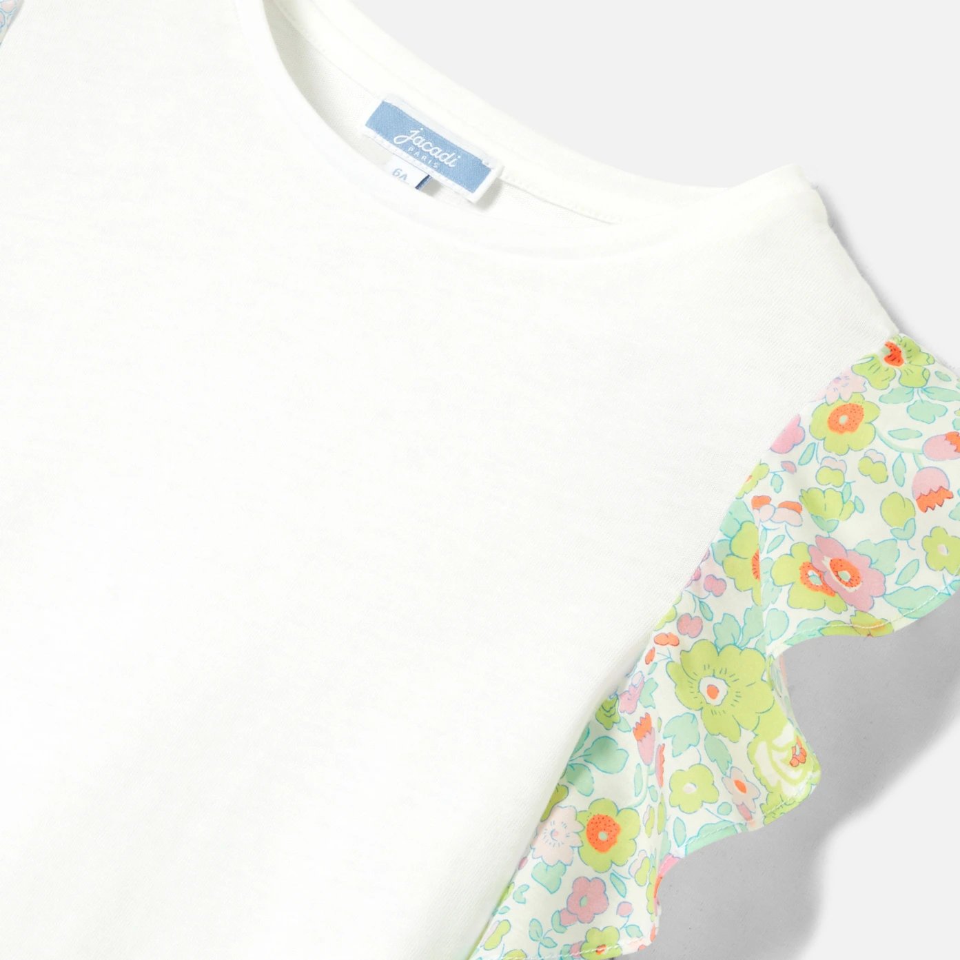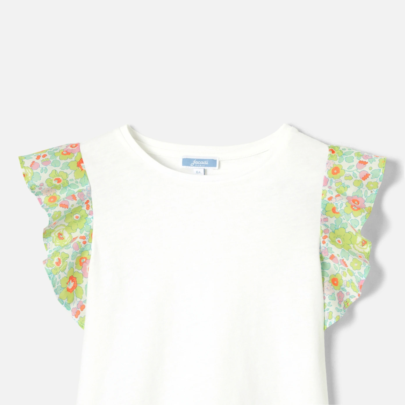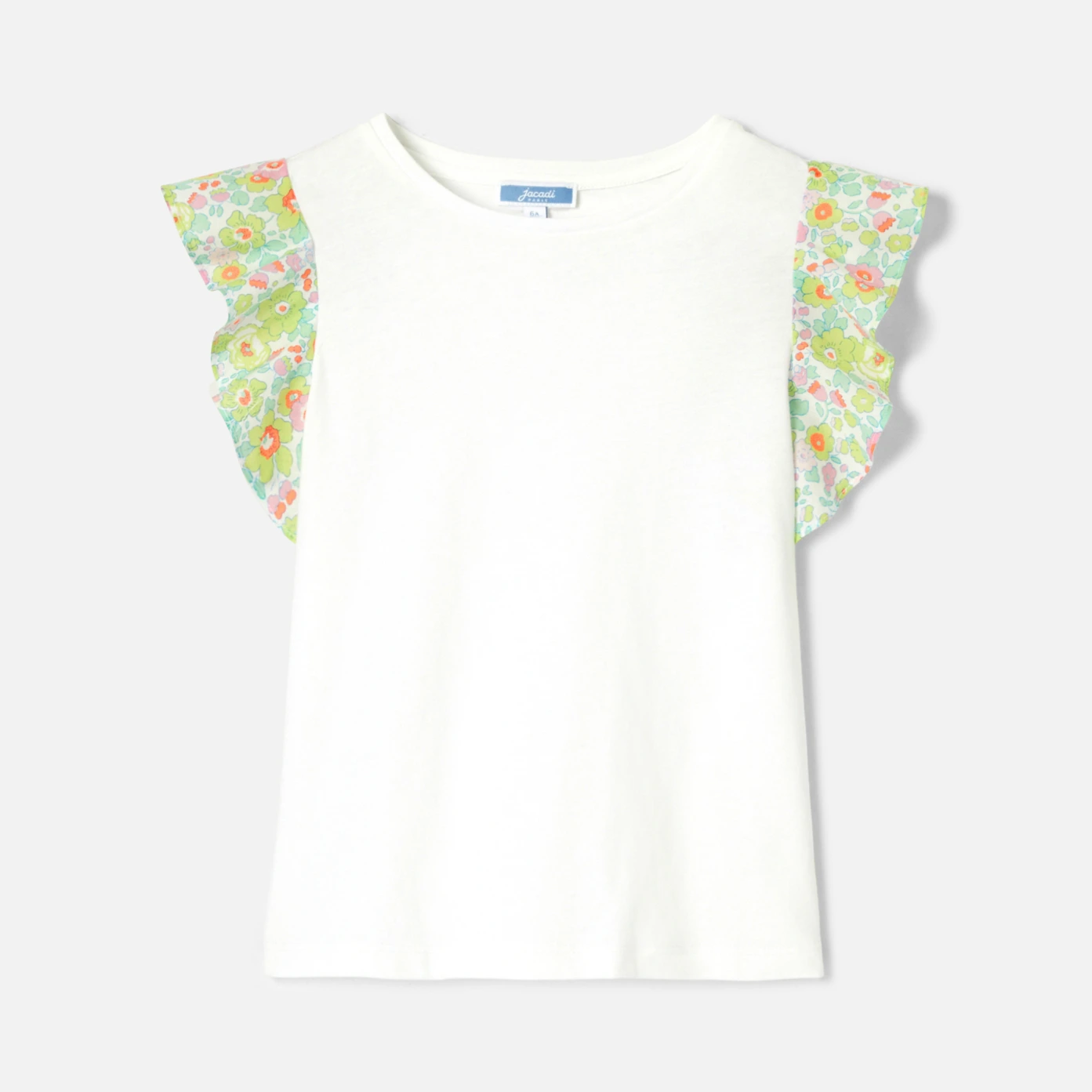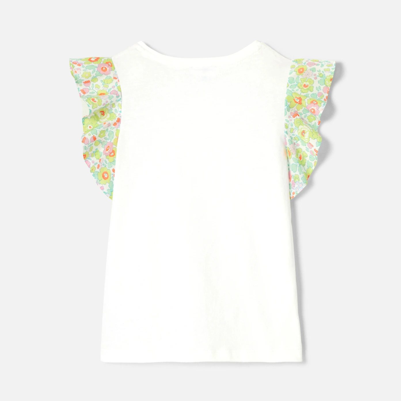 這款可愛的女孩T恤展現了現代舒適的日常風格。採用有機棉製成,袖口飾有Liberty花布的褶飾,為其注入了現代感。可以搭配短褲,打造完美的夏季造型。