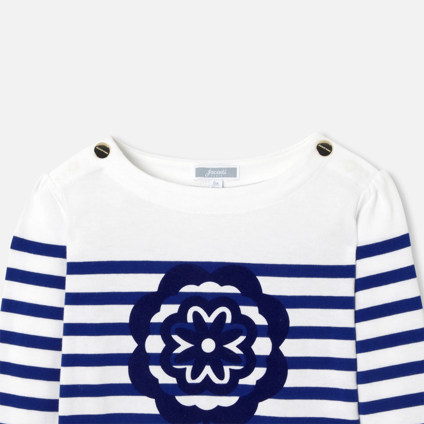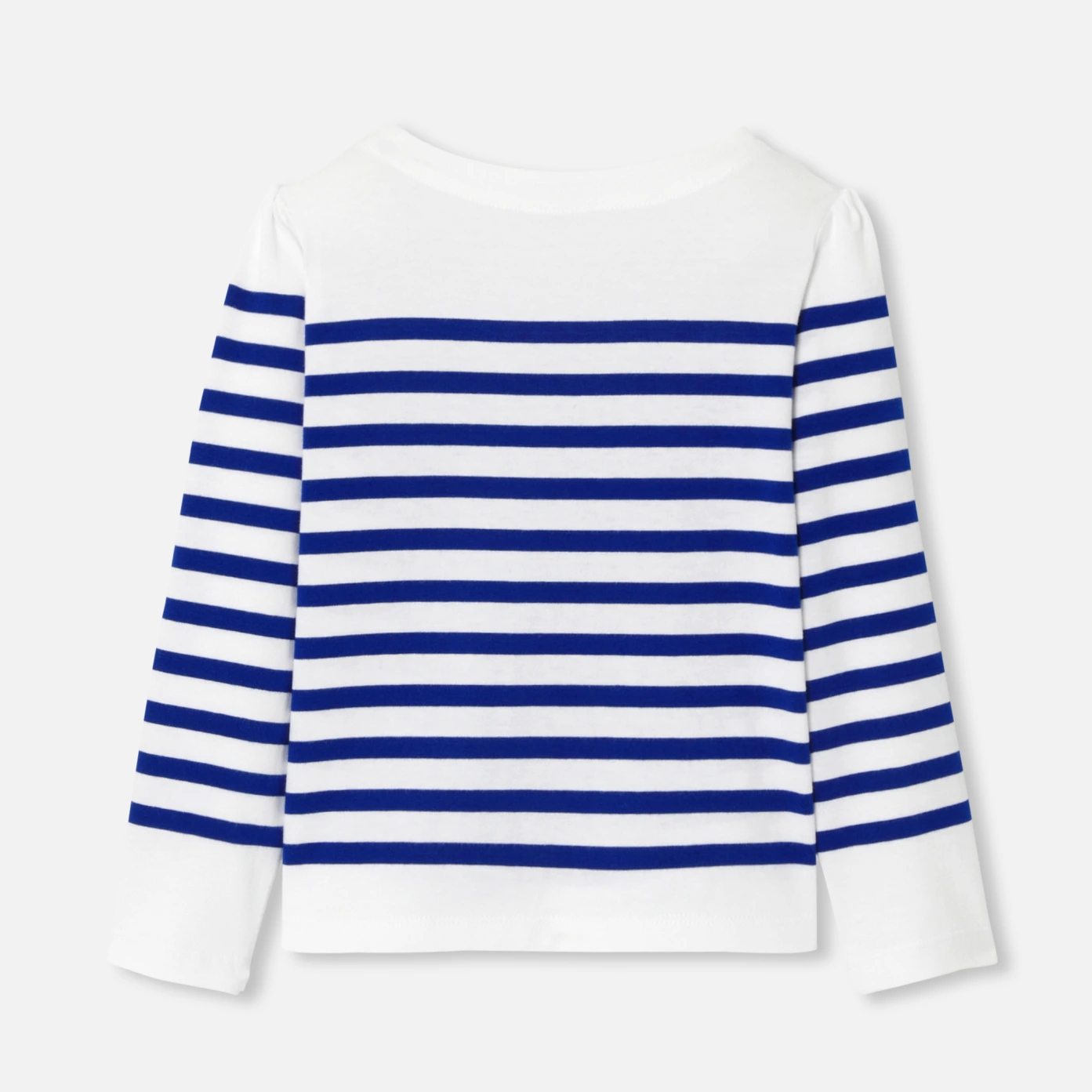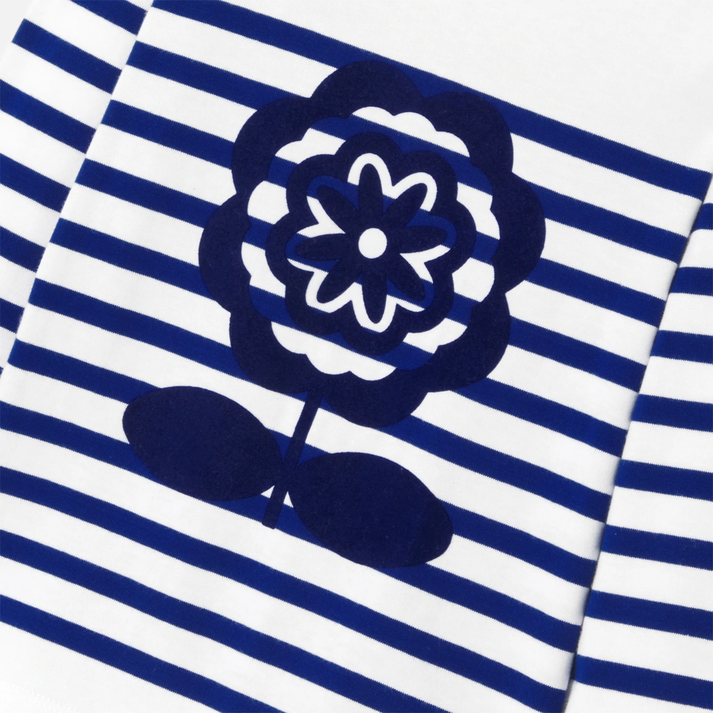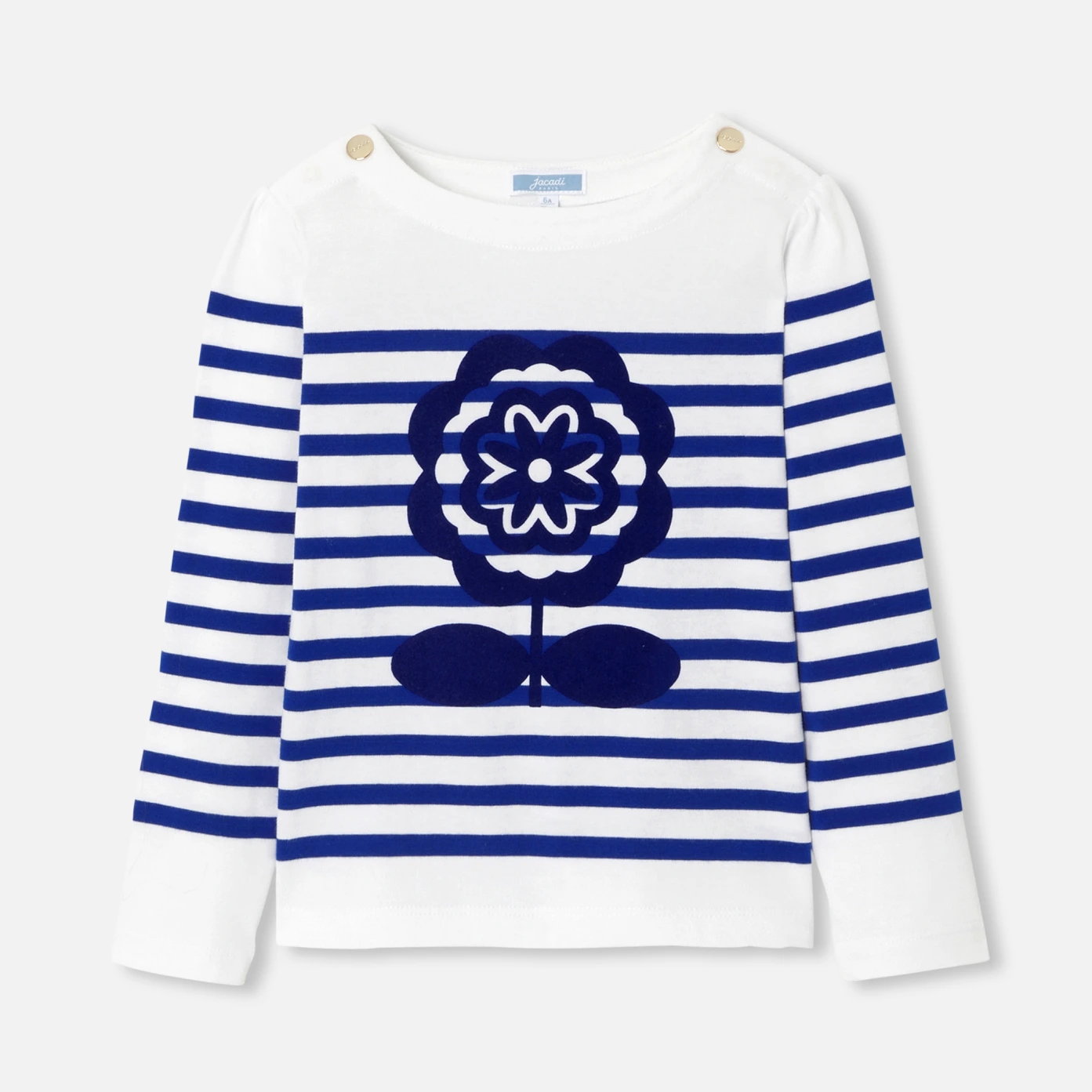 這款布列塔尼條紋上衣採用厚實的針織面料,並以版畫風格的花卉絨毛圖案作為裝飾。搭配牛仔寬褲或燈芯絨長褲、運動鞋和輕便羽絨外套,展現充滿法式魅力的優雅。