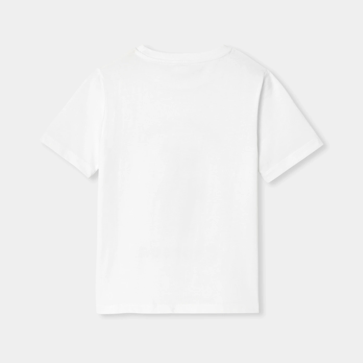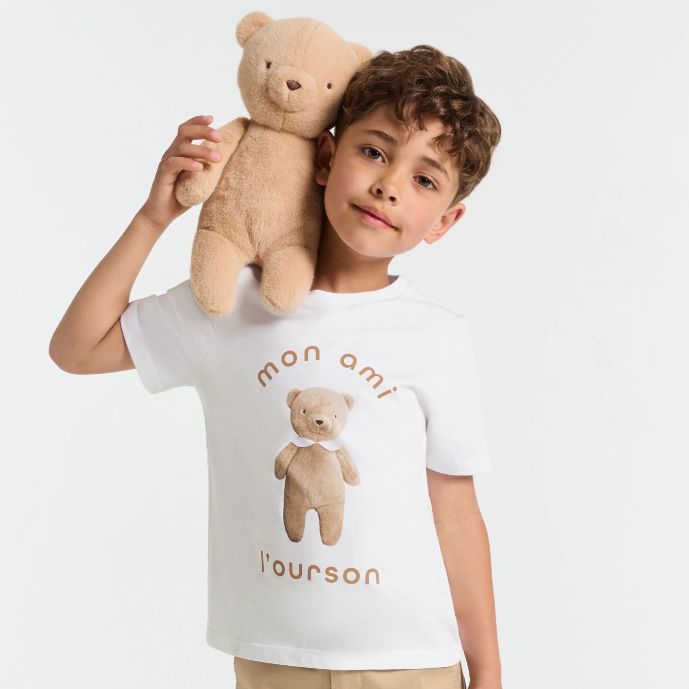 這款男童T恤選用有機棉平紋針織布,正面印有Jacadi 經典吉祥物小熊 Martin 的圖案,為日常造型增添一抹俏皮趣味與原創風格。無論搭配牛仔褲或休閒短褲,皆展現童趣與品牌識別度。
