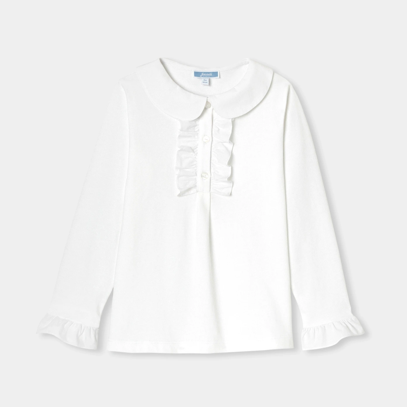 這款經典大女童長袖T恤展現更優雅的風格,別緻的花瓣領結合府綢荷葉邊裝飾,為整體造型增添法式精緻感。採用柔軟有彈性的有機棉針織面料製成,無論搭配格紋裙或寬版牛仔褲,都能演繹出開學季的學院風造型。